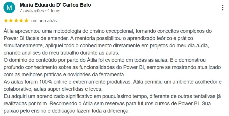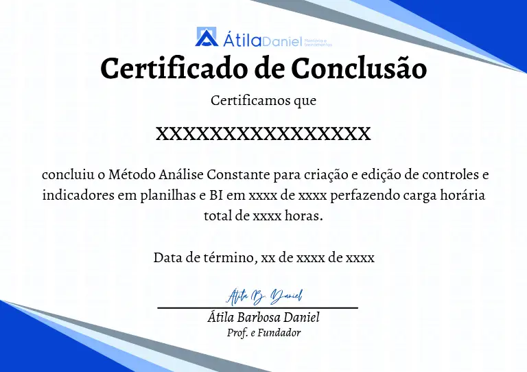 Durante uma ano inteiro duas vez por mês você terá uma call em grupo que começará às 19:30, com o professor Átila Daniel sobre um tema específico que envolva algum aspecto prático sobre Planilhas ou BI para o mercado de trabalho e você poderá tirar todas as duas dúvidas sobre alguma aula do Método Análise Constante.
